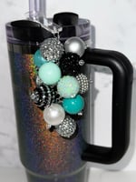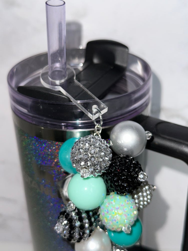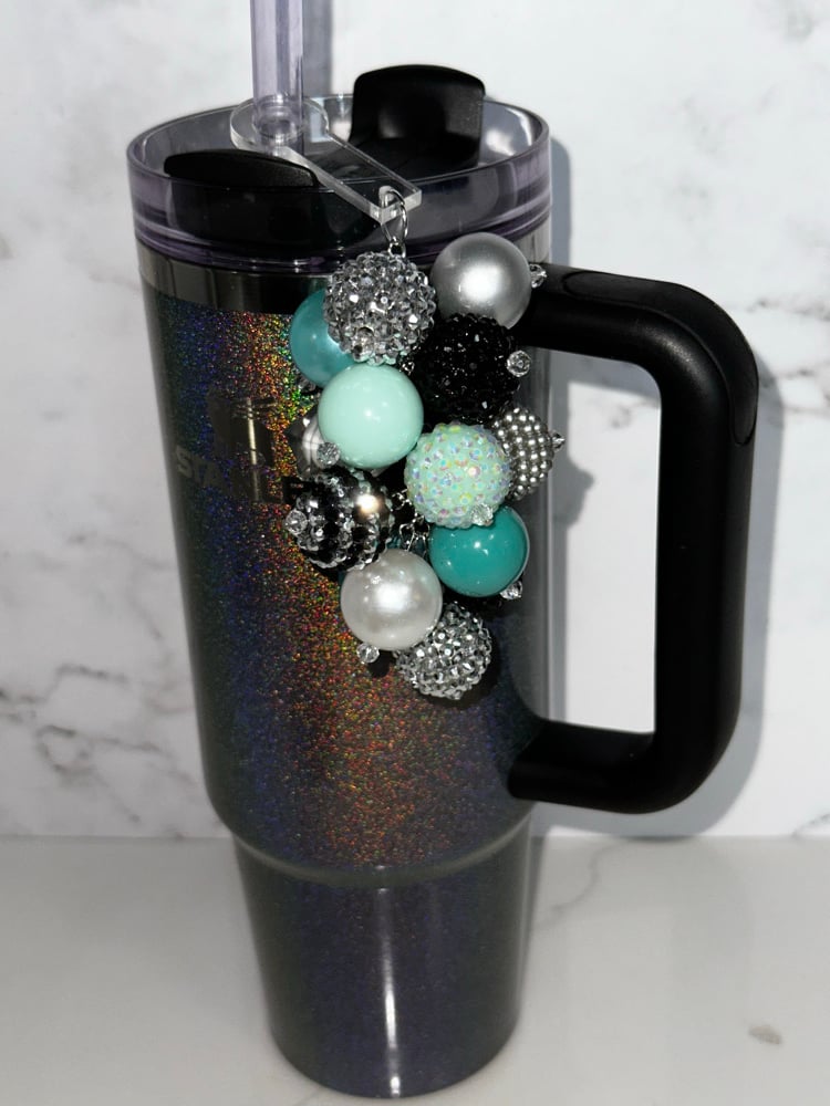 Add sparkle and personality to your tumbler with this handmade straw bauble! Designed with a mix of statement beads in coordinating black, silver, and Tiffany-inspired blue tones, this accessory easily slides onto your straw for an instant glam upgrade.