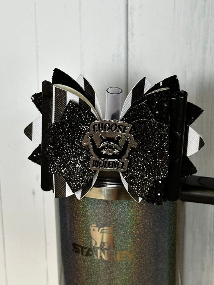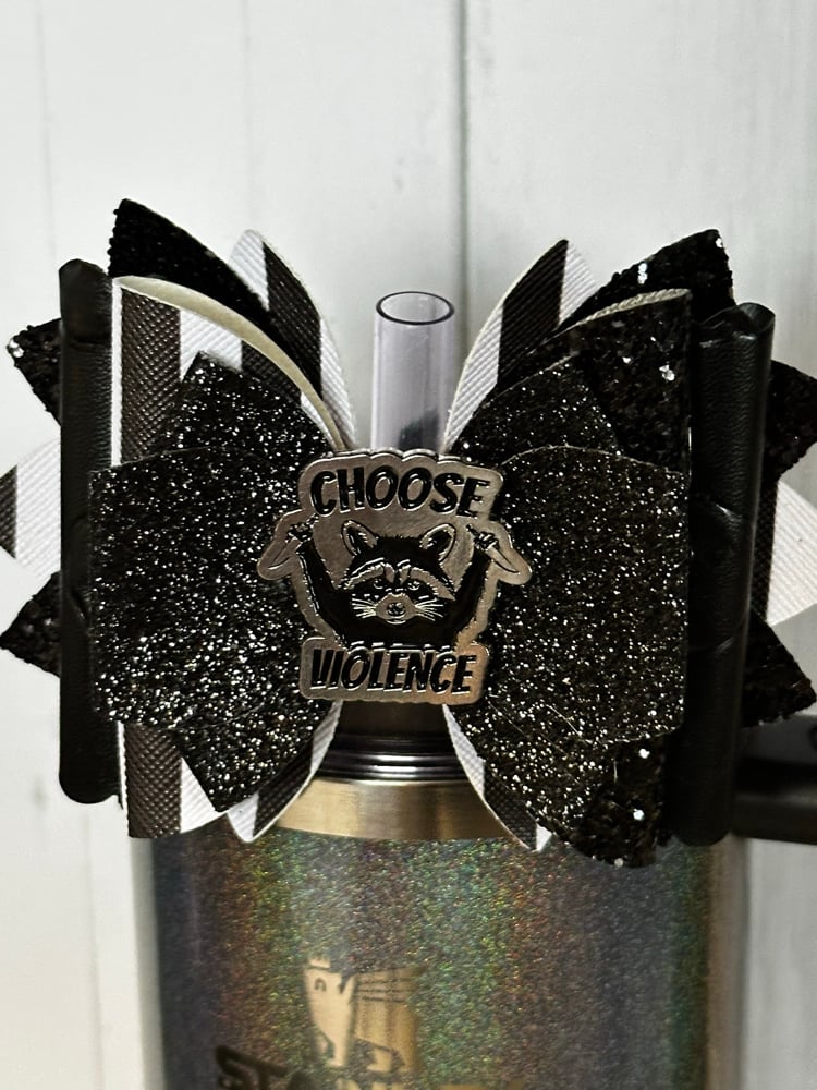Make a bold statement with this edgy, eye-catching straw topper bow. Designed with a striking mix of black glitter, smooth black, and crisp white ribbon layers, this piece brings the perfect balance of glam and attitude. The centerpiece features a unique “Choose Violence” charm with a raccoon design, adding a playful yet fierce touch that stands out on any tumbler.