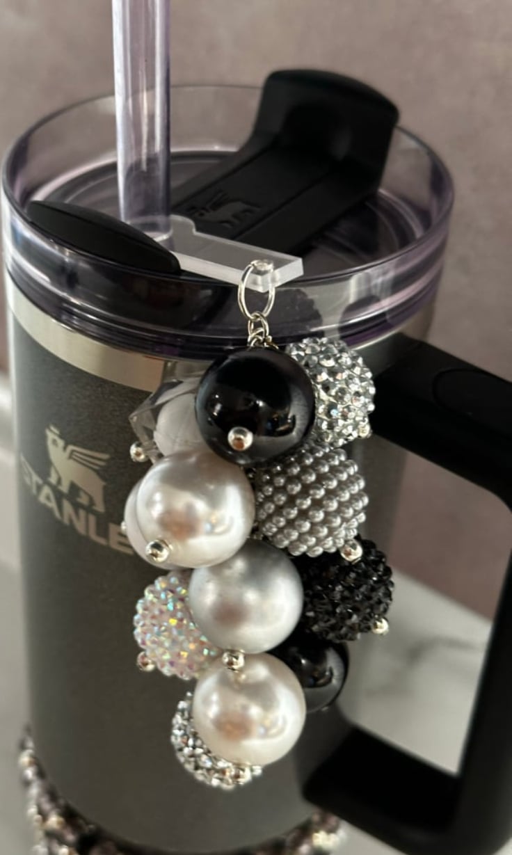 Add the perfect touch of elegance and sparkle to your tumbler with this stunning black, white, and silver straw bauble. Designed with a luxe mix of glossy, pearlized, and rhinestone-studded beads, this piece creates a bold yet sophisticated statement that instantly elevates your cup.