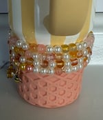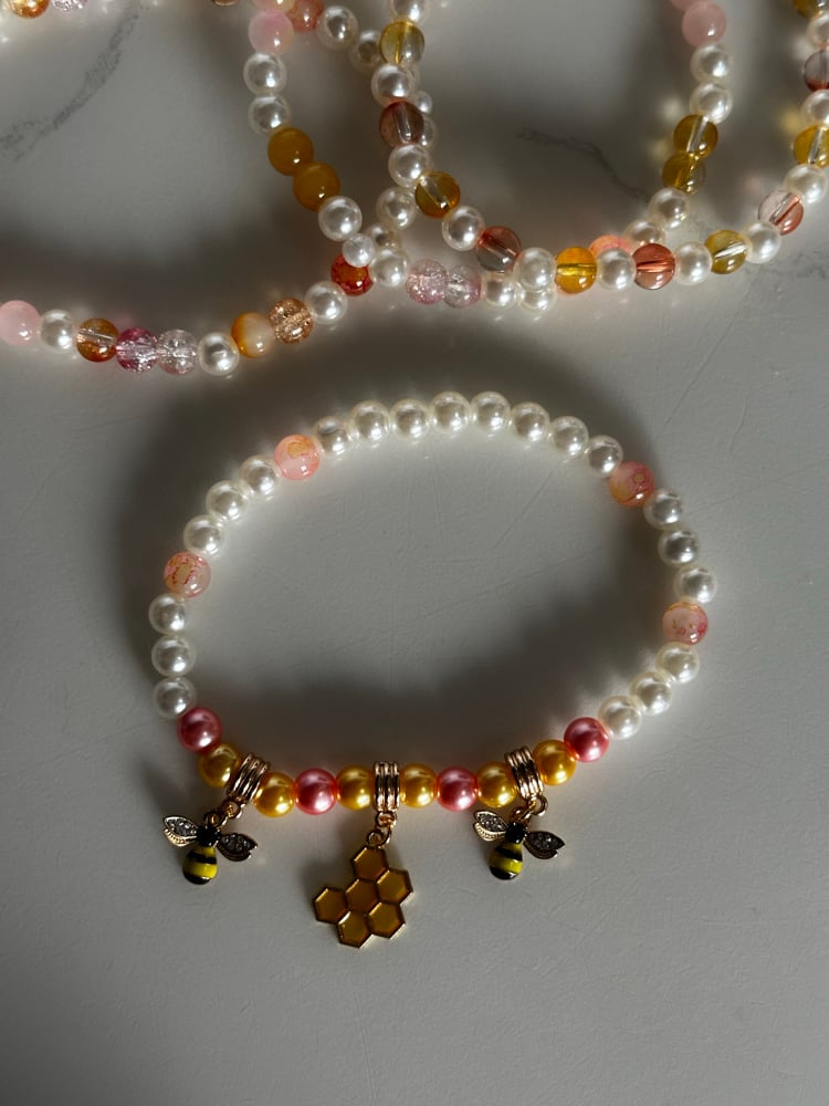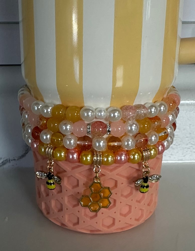 This set of four handcrafted tumbler bracelets wraps your cup in layers of charm and texture. Featuring a mix of pearl beads, translucent accents, and warm honey-toned details, each bracelet adds dimension and personality to your tumbler. Delicate bee and honeycomb charms complete the theme, giving the set a playful yet elegant finish.