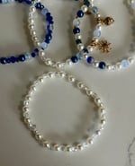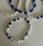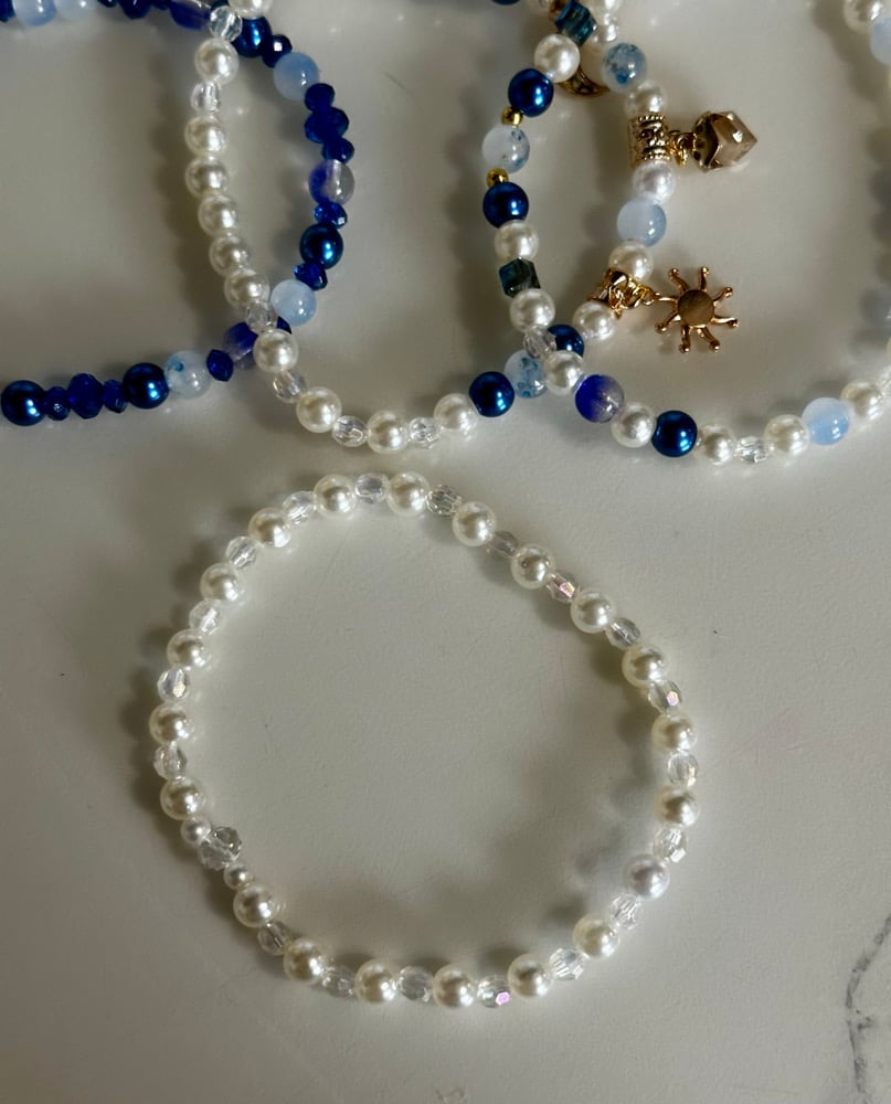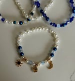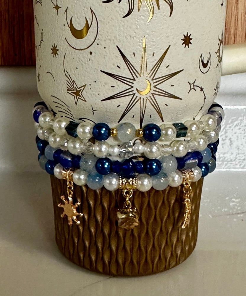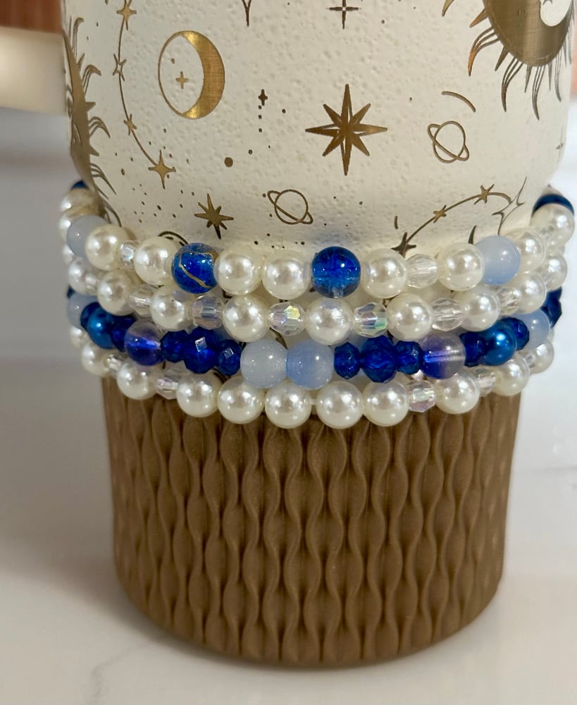 Elevate your tumbler with this elegant cream and blue bracelet stack, designed to add a soft, celestial-inspired touch to your cup. This set features a beautiful mix of creamy pearl beads, deep navy accents, and light blue tones, creating a dreamy, balanced look that pairs perfectly with neutral or star-themed tumblers.