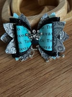 This handcrafted bow features a bold mix of black glitter and smooth faux leather layers, paired with a signature-inspired aqua print for that iconic, high-end look. At the center, a sparkling rhinestone embellishment anchors cascading crystal strands that drape beautifully down your cup, finished with a beautiful crown embellishment.