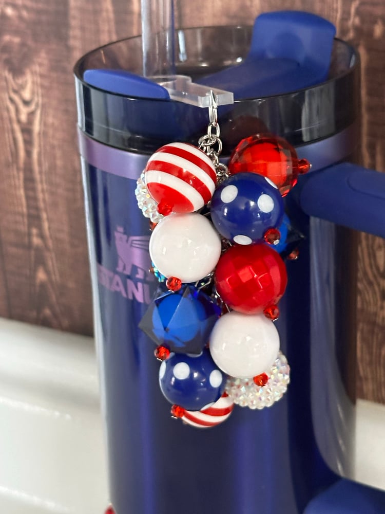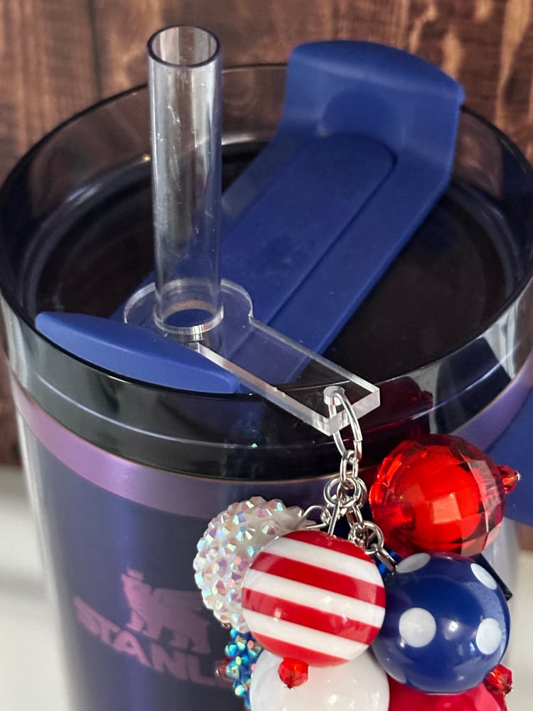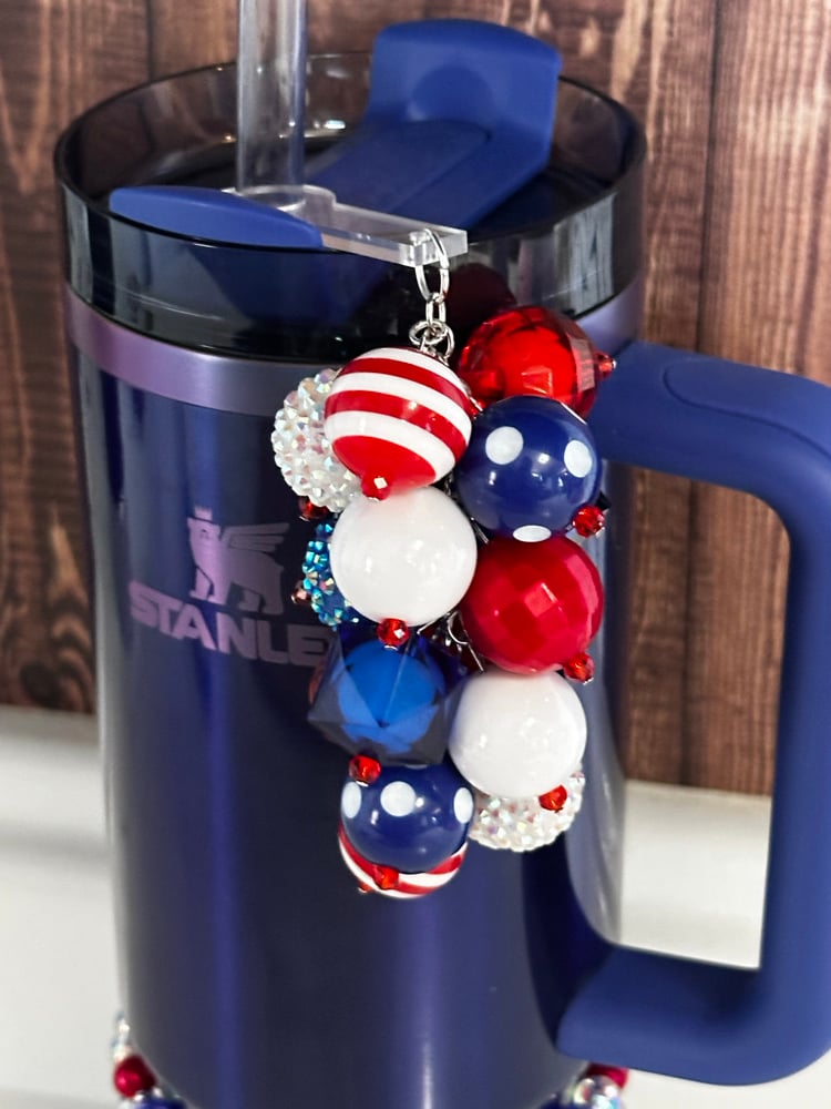 Elevate your tumbler with this dazzling patriotic straw bauble! Featuring a mix of glossy, glitter, and rhinestone-style beads in red, white, and blue, this charm adds movement, shine, and personality to your cup. Perfect for pairing with themed accessories, it creates a fun, coordinated look that stands out.