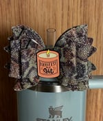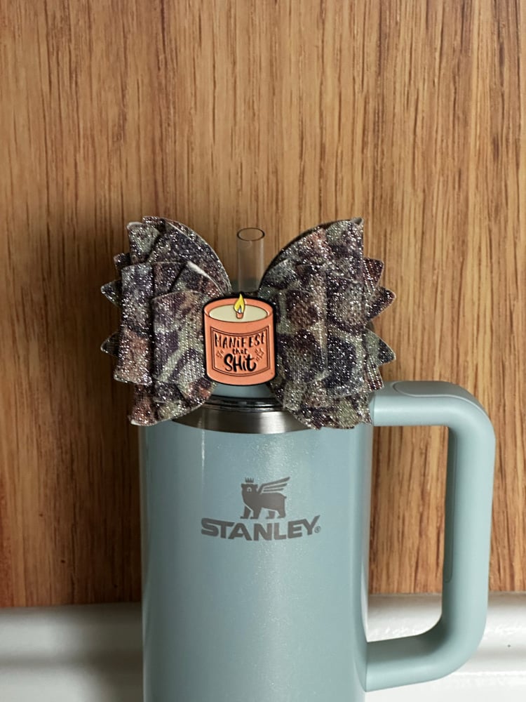 Add a bold and inspiring touch to your favorite tumbler with this camo glitter straw topper bow. Designed with a unique camouflage pattern and a subtle sparkle finish, this statement piece blends rugged style with a hint of glam. At the center, a fun candle charm featuring the phrase “Manifest That Sh*t” adds personality and motivation to your daily routine.