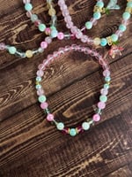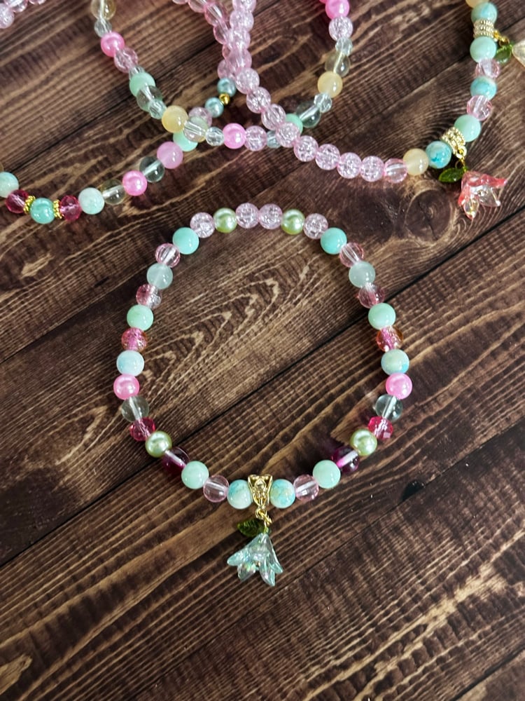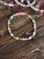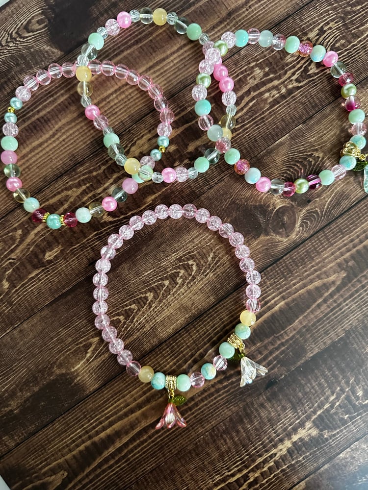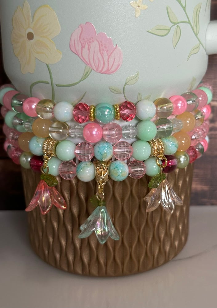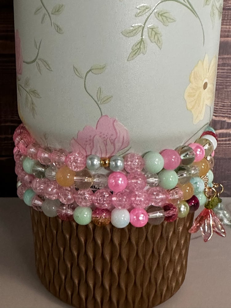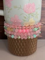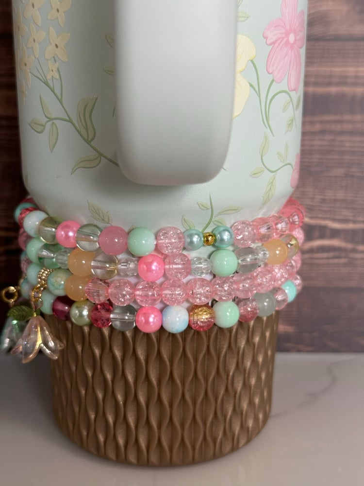 Dress up your tumbler with this Spring Blossom inspired bracelet stack, designed to beautifully complement the colors and floral feel of the Spring Blossom cup. This stack features a mix of glass, acrylic, and metal beads in soft pastel shades including mint, pink, yellow, and light green, along with delicate floral charms for a springtime look.