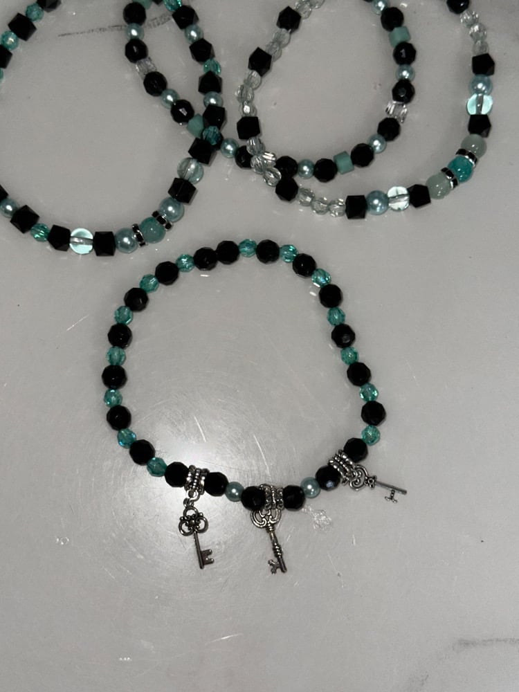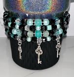 Give your tumbler a little extra sparkle with this handmade bracelet boot stack! This stack features a mix of acrylic, glass, and specialty beads in black, silver, and Tiffany-inspired blue tones for a glamorous look.